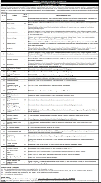 PTV hires candidates for many departments. Some commonly announced posts include: